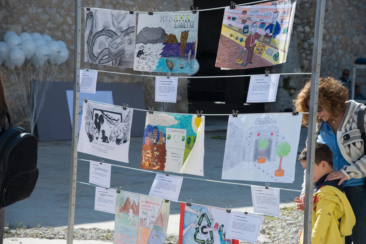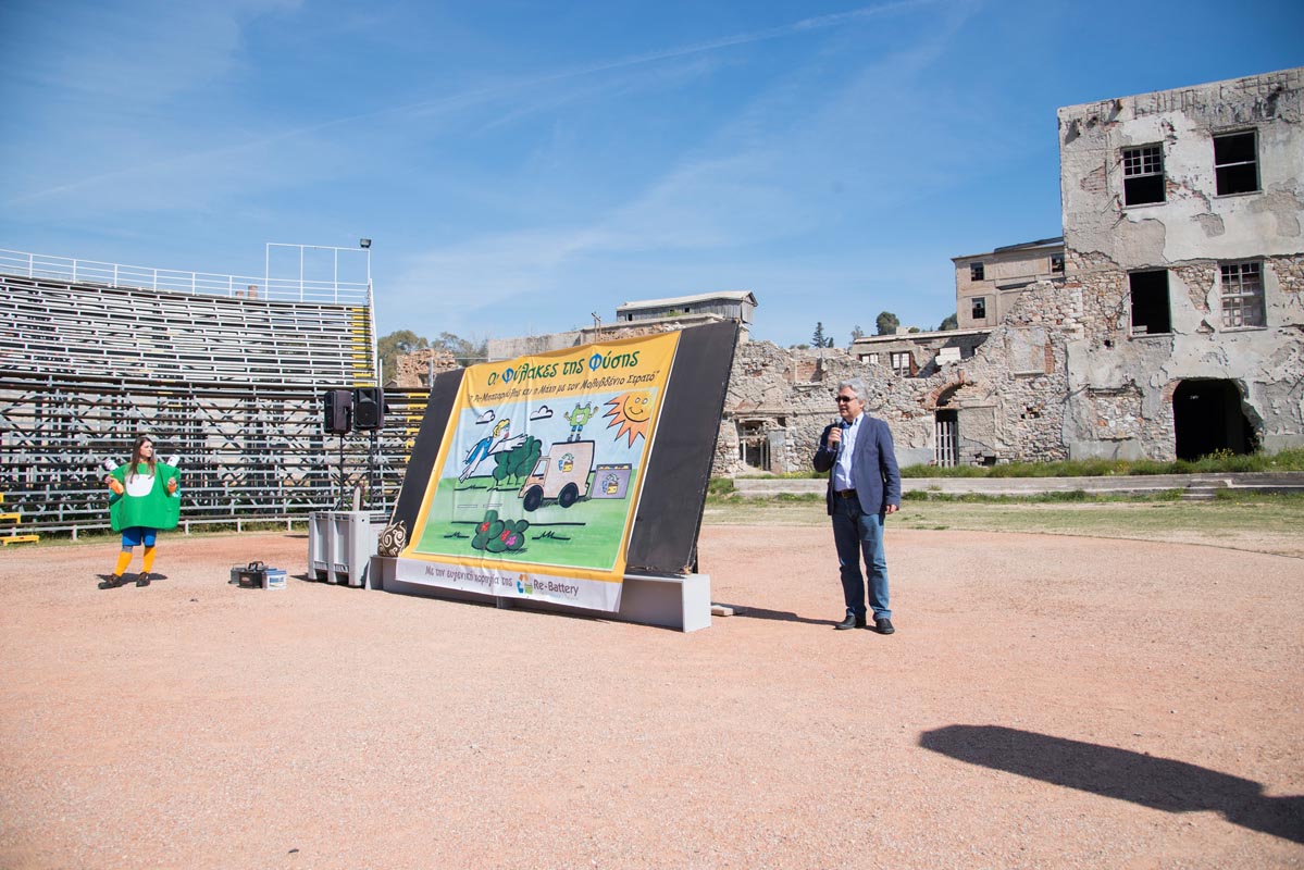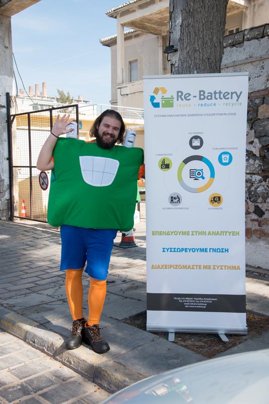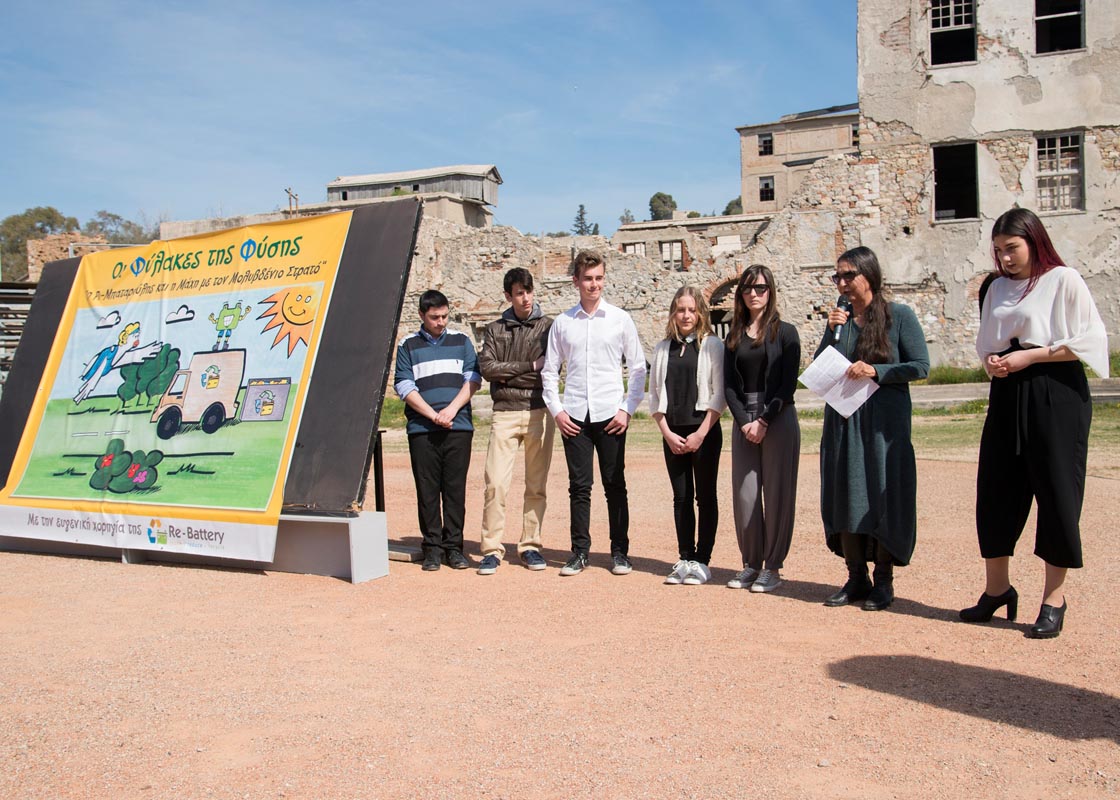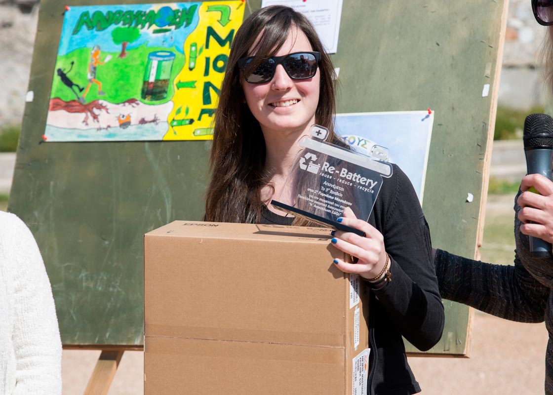 Διαγωνισμό και τα στελέχη της εκπαίδευσης που στήριξαν και παρευρέθηκαν στην εκδήλωση, κ.κ. Παναγιώτη Σπύρου, Διευθυντή Σπουδών και Αλεξάνδρα Τσίγκου, Πρόεδρο Κριτικής Επιτροπής Διαγωνισμού, ενώ δεν παρέλειψε να αναφερθεί στους χορηγούς της εκδήλωσης Ι. ΧΟΥΜΑΣ ΑΕΒΕ, Linde Hellas Ltd, ΠΕΤΡΟΓΚΑΖ ΑΕ καθώς και στο ΣΕΔ ΑΦΗΣ ΑΕ που συμμετείχε στην εκδήλωση. Τέλος απευθυνόμενη στους παρευρισκόμενους γονείς και μικρούς μαθητές, τους ευχαρίστησε για την αθρόα προσέλευση και συμμετοχή τους που βοηθούσης και της ηλιόλουστης μέρας συνέβαλαν στο να γίνει η εκδήλωση της Re-Battery, ένα όμορφο, χαρούμενο, ζωγραφικό και θεατρικό πανηγύρι, ύμνος των παιδιών στην ανακύκλωση και την περιβαλλοντική προστασία.