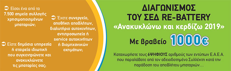 Στόχος της νέας πρωτοβουλίας του ΣΕΔ Re-Battery είναι η επιβράβευση της ευθύνης και της συμμετοχής στη σωστή διαχείριση των αποβλήτων συσσωρευτών με σκοπό την προστασία του περιβάλλοντος.
