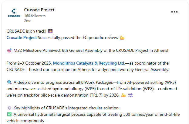 Το CRUSADE (Recycling technologies for ELV components to create a sustainable source of market-grade materials for EU applications) είναι ένα φιλόδοξο ευρωπαϊκό έργο που χρηματοδοτείται από το πρόγραμμα Horizon Europe και στοχεύει στην ανάπτυξη και επίδειξη μιας πιλοτικής, πλήρως αυτοματοποιημένης, ψηφιακά καθοδηγούμενης μονάδας ανακύκλωσης κρίσιμων πρώτων υλών από εξαρτήματα οχημάτων στο τέλος του κύκλου ζωής τους (ELVs), όπως:
