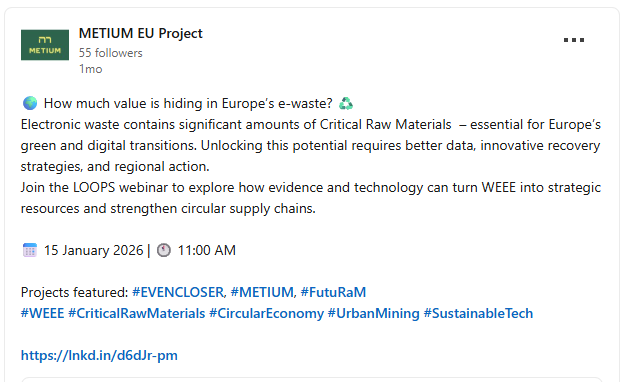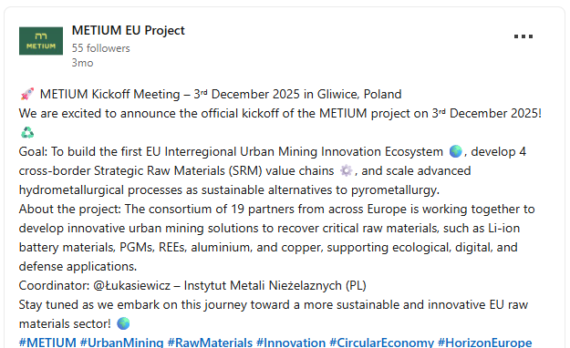 Το METIUM (Metallurgical Urban Mining for SRM Recovery) είναι ένα ευρωπαϊκό έργο που στοχεύει στη δημιουργία του πρώτου «Αστικού Μεταλλείου» σε ευρωπαϊκό επίπεδο. Μέσω καινοτόμων τεχνολογιών υδρομεταλλουργικής επεξεργασίας, το έργο επιδιώκει την ανάκτηση Δευτερογενών Πρώτων Υλών (SRMs) από έξι ρεύματα αποβλήτων: μπαταρίες λιθίου, καταλύτες, μπουζί, πλακέτες κυκλωμάτων (PCBs), πλυντήρια και φωτοβολταϊκά πάνελ. Οι τεχνολογίες αυτές οργανώνονται σε τέσσερις βασικές αλυσίδες αξίας SRM: