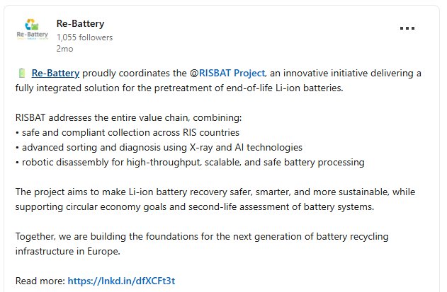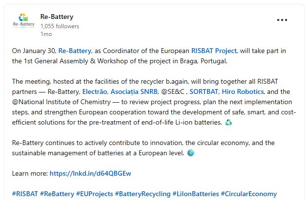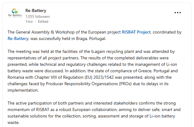 Μέσα από τον ρόλο της στο RISBAT, η RE-BATTERY ενισχύει τη θέση της ως βασικός εθνικός και ευρωπαϊκός φορέας κυκλικής οικονομίας στον τομέα των μπαταριών, συμβάλλοντας ουσιαστικά στη βιώσιμη διαχείριση αποβλήτων και στη στρατηγική αυτονομία της ΕΕ σε κρίσιμες πρώτες ύλες.