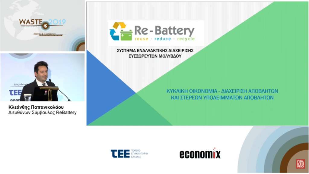 Την πρόταση πιλοτικής εφαρμογής βιομηχανικής συμβίωσης παρουσίασε ο Κλεάνθης Παπανικολάου, Διευθύνων Σύμβουλος της Re-Battery, στο Συνέδριο του ΤΕΕ, με τίτλο «WASTE 2019: Στερεά και Υγρά Απόβλητα», που διοργάνωσε το economix, υπό την αιγίδα του Υπουργείου Περιβάλλοντος & Ενέργειας.