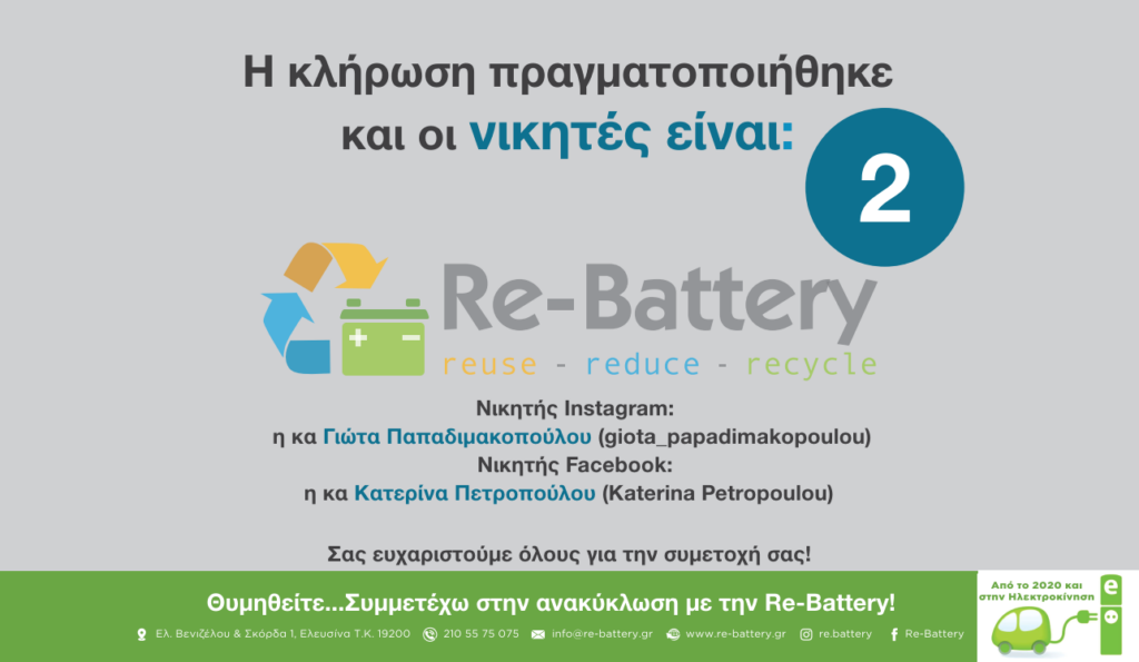 Παρακαλούμε οι νικητές να επικοινωνήσουν έως 31/12/2021 ώρα 12:00 το μεσημέρι, με τη Re-Battery στο τηλέφωνο 210-5575075 ή στο email info@re-battery.gr, για τη γνωστοποίηση των στοιχείων τους, αναφορικά με την αποστολή του δώρου τους.