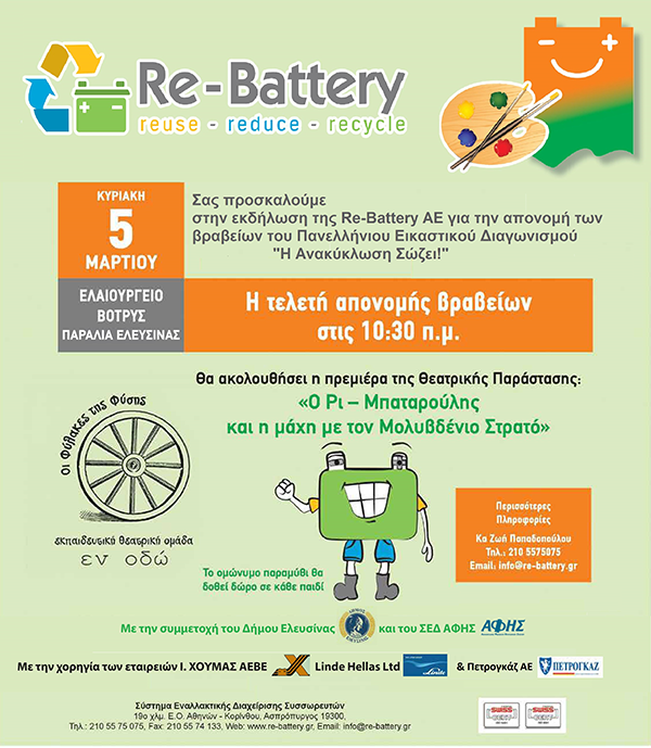 ΔΕΛΤΙΟ ΤΥΠΟΥ: Εκατοντάδες παιδιά και χαμόγελα στις εκδηλώσεις της Re-Battery AE για την απονομή βραβείων και την πρεμιέρα της θεατρικής παράστασης «Ο Ρι-Μπαταρούλης» στις 05/03/2017, στην Ελευσίνα