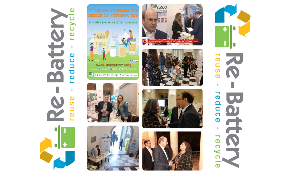Tο Πανελλαδικό Σύστημα Εναλλακτικής Διαχείρισης Αποβλήτων Συσσωρευτών «Re–Battery A.E» έδωσε το δικό του ξεχωριστό παρόν στη διήμερη γιορτή ευαισθητοποίησης του κοινού στο θέμα της ανακύκλωσης, που διοργάνωσε ο Ελληνικός Οργανισμός Ανακύκλωσης (Ε.Ο.ΑΝ.) στην Κηφισιά (Βίλα Καζούλη), στο πλαίσιο της ευρωπαϊκής εβδομάδας μείωσης αποβλήτων.